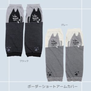 二の腕までしっかりカバーのロングではなく、こちらは肘より短いショートタイプ。長袖、七分袖のお洋服に合わせて使いやすい長さです。肉球の刺繍は特殊な糸が使われていて紫外線に当たると紫色に変化します。紫外線から守られてる~って感じながら夏の日焼け防止にご活用ください