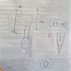転院先の先生が書いてくださった図解。右腎臓と尿管に赤い丸があるのが結石